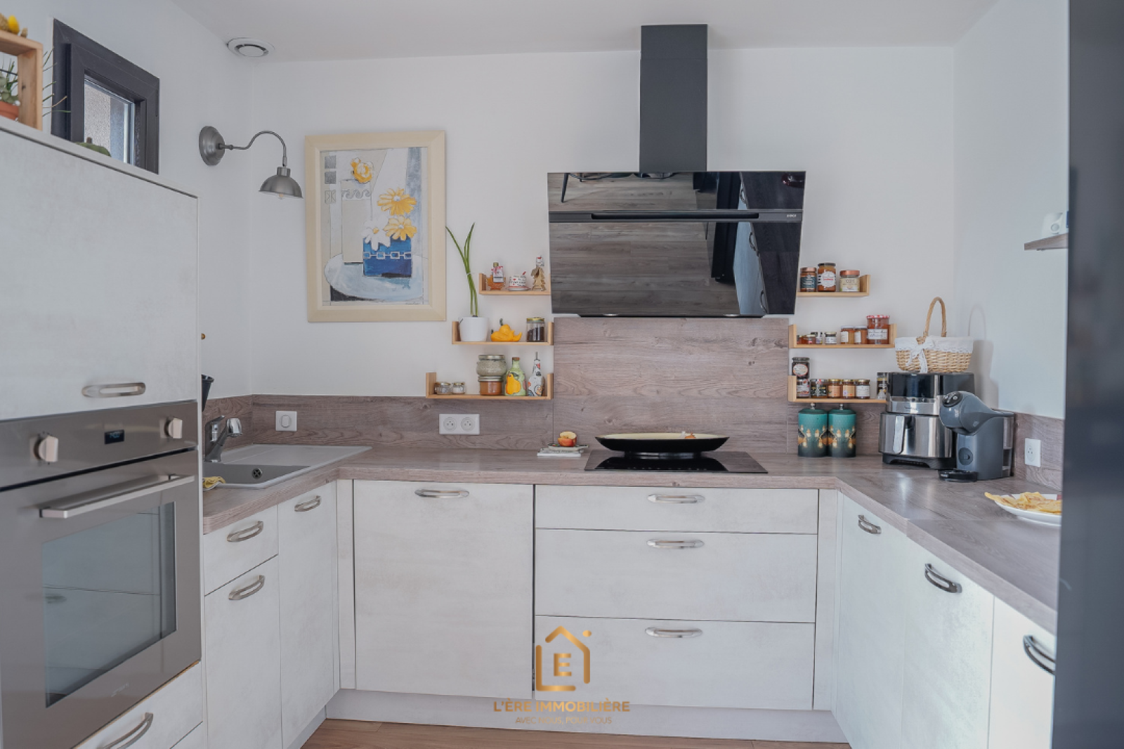 Une cuisine ouverte, entièrement équipée (four, hotte, plaque, réfrigérateur)