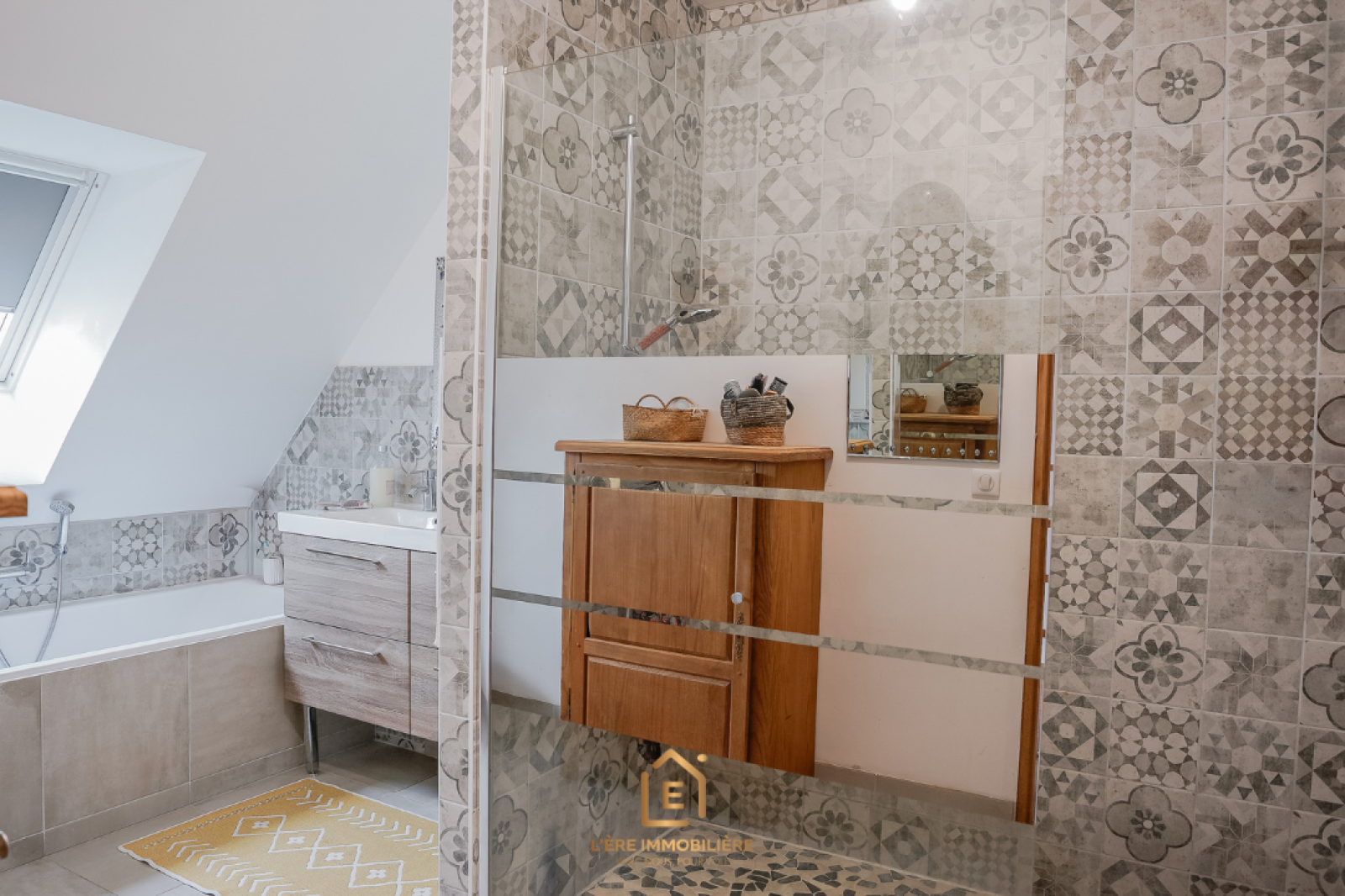 Une salle de bain de 8m² habitables équipée d’une double vasque, d’une douche, d’une baignoire et d’un WC suspendu