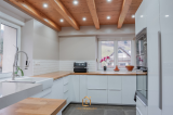 Cuisine ouverte entièrement équipée : meubles hauts/bas, four, plaque, hotte et micro-ondes