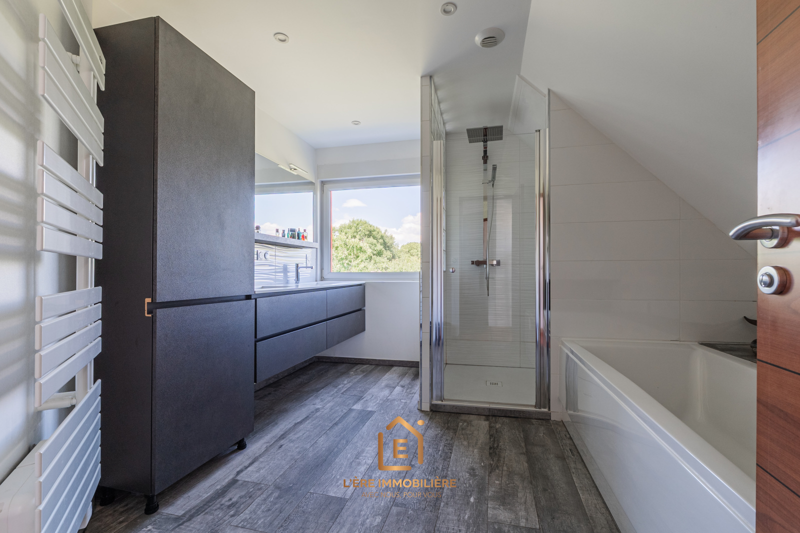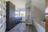 - Une grande salle de bain avec baignoire et douche à l’italienne.