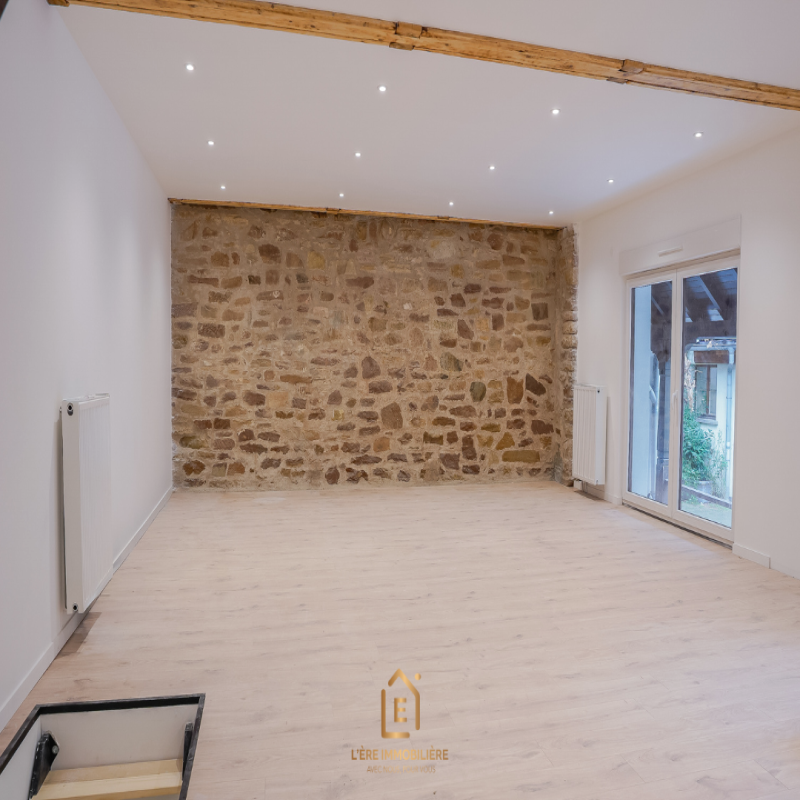 Pièce de vie au charme unique grâce à son mur en pierre mis en valeur,